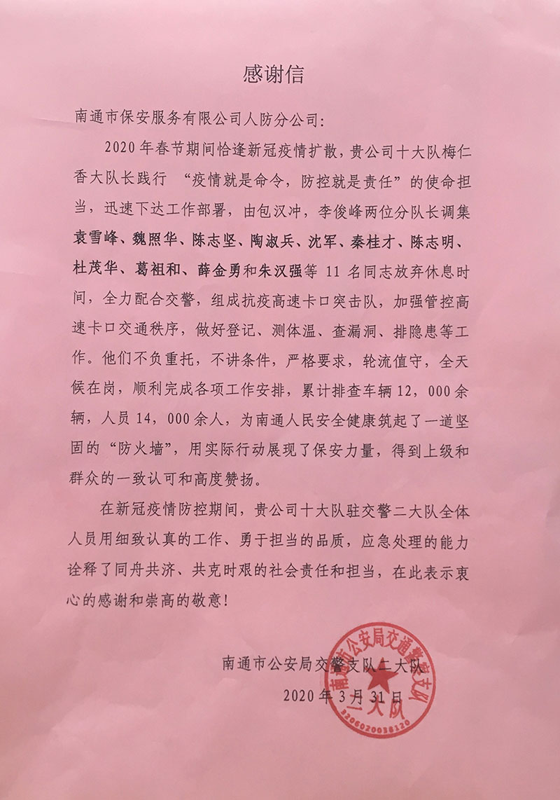 期間,隊員們放棄休息時間,24小時輪班值守,做好檢查、登記、測溫等工作,始終堅守在疫情防控第一線。累計排查車輛12000余輛,人員14000余人,用實際行動為南通人民安全健康筑起了一道堅固的“防火墻”。