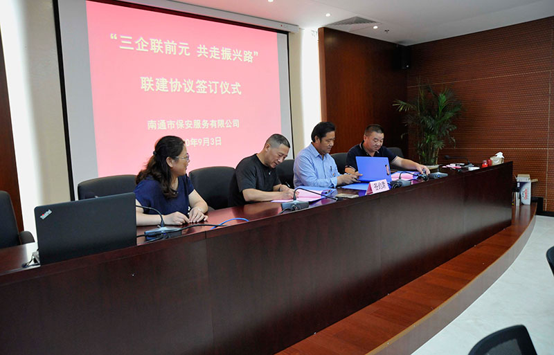 9月3日上午,“三企聯(lián)前元,共走振興路”聯(lián)建簽約儀式活動(dòng)在保安公司四樓會(huì)議室成功舉行。城建集團(tuán)下屬南通市保安服務(wù)有限公司、南通市綠化造園開發(fā)有限公司、南通國(guó)信資產(chǎn)管理有限公司三家子企業(yè)與連云港東??h黃川鎮(zhèn)前元村簽訂聯(lián)建協(xié)議。連云港東??h黃川鎮(zhèn)副書記朱斌一行6人,國(guó)資委副調(diào)研員郁衛(wèi)東、黨群處處長(zhǎng)曹權(quán)、城建集團(tuán)副總經(jīng)理朱紅軍以及保安公司等三家企業(yè)的負(fù)責(zé)人出席了簽約儀式。